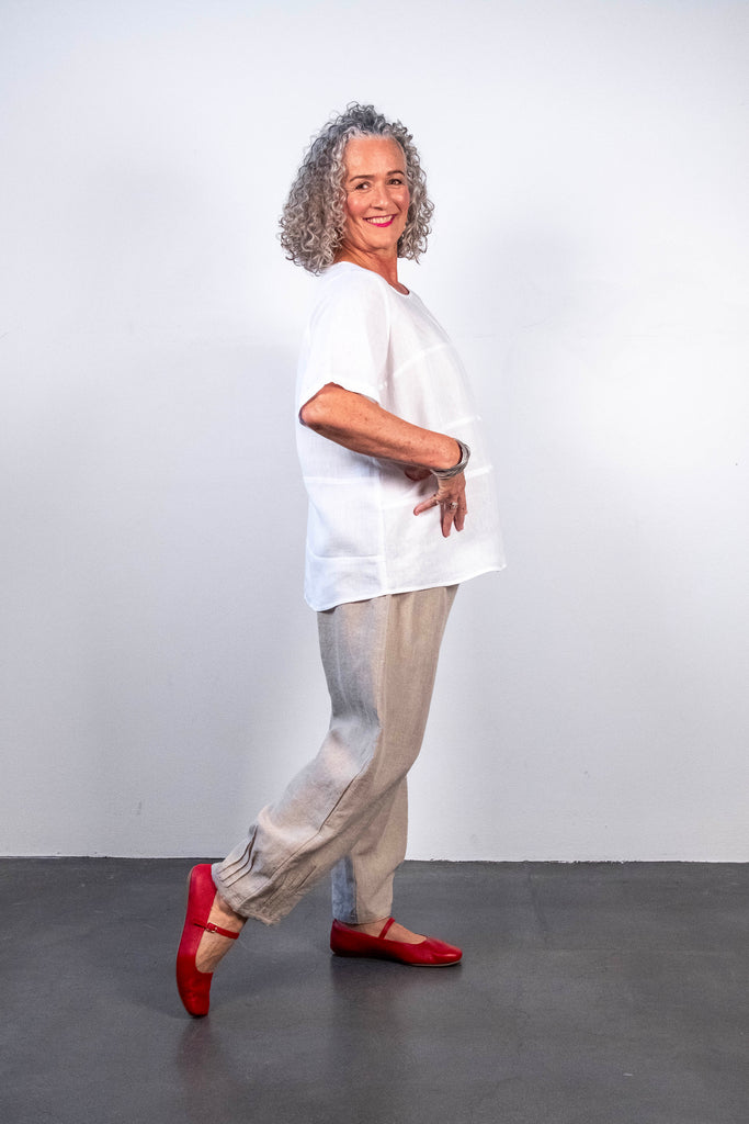 Our best selling pant.  Cotton jersey waist for comfortable fit, cute little pockets on the back and a tapered leg with interesting pin tucks at the hem front and back.